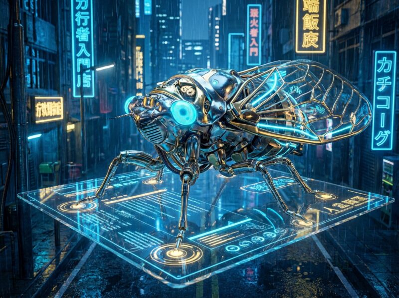 A cybernetic cicada insect diagnosing a glowing futuristic server room, with a traditional cup of tea resting on a server rack